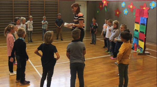 prvošolci skupaj z učiteljico Nado in svojimi pomočniki iz 5. razreda odšli v
