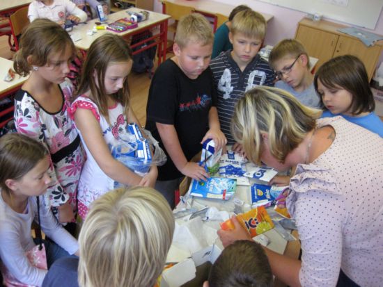 Najstarejši pa so spretno prepogibali, rezali, lepili-iz odvržene tetrapak embalaže so počasi a vztrajno nastajale zanimive in uporabne denarnice. |