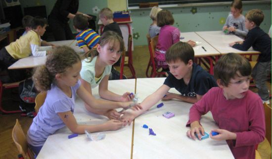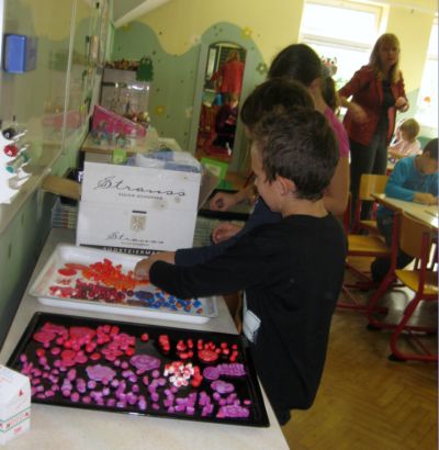 ![]() Učenci drugega in tretjega razreda so pridno oblikovali valjali, rezali-nastajale so ploščice, kroglice, ki so jih kasneje nanizali na vrvico in nastale so zanimive ogrlice. |