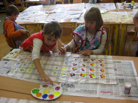 | Vse ostale dni v tednu smo pridno ustvarjali v delavnicah. Učenci prvega razreda so tiskali na blago iz katerega bomo sešili vrečice za začimbe in dišavnice, ki rastejo na naši gredici. | ![]() |