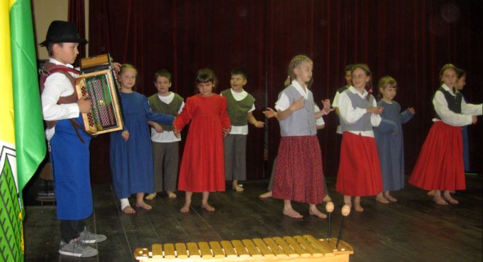 uvod v srečanje. Z otroškimi igrami, petjem in plesom so se predstavili učenci,