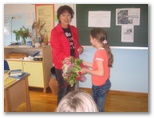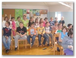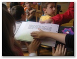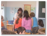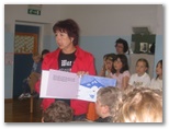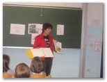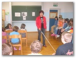 V četrtek, 22. maja nas je obiskala pisateljica Aksinija Kermauner. Po uvodnem nagovoru knjižničarke Nataše Markič nam je avtorica predstavila svoje življenje in delo. Izvedeli smo, da je profesorica slovenščine in likovnega pouka na Zavodu za slepo in slabovidno mladino v Ljubljani. Je mati štirih hčera. Napisala je več zelo zanimivih del z različnih področij: pesniško zbirko Ples pravljic, za odrasle tri nadaljevanja romana Dnevnik Hiacinte Novak, prvo slovensko avtorsko tipno slikanico za slepe Snežna roža, več dramskih tekstov za slepe in slabovidne otroke: Kakšne barve je tema, Jedec sveta, Z belo palico, Tema ni en črn plašč, zbirko otroških anekdot Koliko sem bila stara, ko sem se rodila?, lutkovno igro Polna luna in shujševalna kura, poučni zgodovinsko obarvan mladinski roman Modrost starodavnega anka, zbirko knjižic za mlade bralce Izi in Bizi, detektivki Juhuhu pa ena gnila plastenka in Fuj, pivoled, za mladino je napisala Berenekini kodri. To delo je bilo nagrajeno na knjižnem sejmu v Bologni in je nominirano za nagrado Desetnica. Lansko leto pa je izdala še knjigo Smaragdna obzorja. Predstavila nam je branje slabovidnih in slepih. Tudi sami smo se poizkusili v branju brajlove pisave in otipali slikanice. Predstavila nam je tudi najrazličnejše pripomočke, ki jih uporabljajo pri učenju tega branja. Pokazala nam je belo palico in način hoje z njo. Upodabljanje slepih v literaturi Aksinijo zelo zanima, ker se že dvajset let ukvarja s slepoto in slabovidnostjo. Rada bi povedala svetu, da slepota ni nekaj strašljivega, tujega. Ljudje se zelo bojimo tistega, česar ne poznamo. To »temo« videčih skuša razsvetliti. Ura prijetnega druženja je hitro minila. Učenka se ji je zahvalila za obisk in ji izročila šopek cvetja, katerega je bila naša gostja zelo vesela.