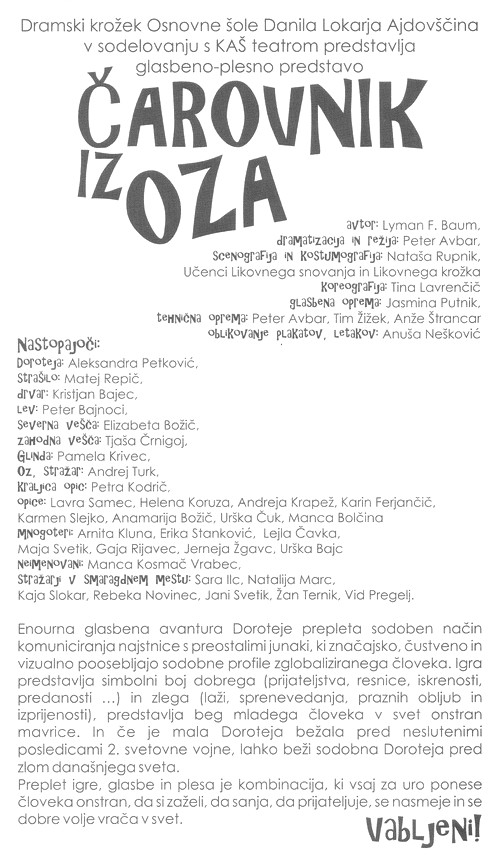 Čarovnik iz Oza 8. maja smo si v izvedbi gledališkega krožka naše šole premierno ogledali predstavo Čarovnik iz Oza. Njen režiser in dramaturg, gospod Peter Avbar, je tokrat k sodelovanju povabil tudi nekaj zunanjih sodelavcev, ki so skupaj z učenci naše šole odigrali zares fantastično. Glavni igralci Aleksandra Petković – Doroteja, Kristjan Bajec – drvar, Matej Repič – strašilo ter Peter Bajnoci – levček so skupaj z drugimi nastopajočimi odigrali tako prepričljivo, da so v treh dneh v ajdovsko Dvorano prve slovenske vlade privabili 1500 gledalcev. Predstava je zares vredna ogleda, tudi večkratnega. Za to bo zagotovo še priložnosti, ena izmed njih bo Štrudelfest.