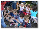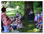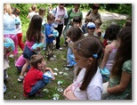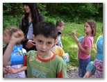 V sredo, 11. junija, smo se z avtobusom zapeljali v lep sončen dan proti Uncu. Obiskali smo deželo, kjer prebiva Jezerko. O njem smo slišali zanimivo zgodbo. Za Jezerka smo izdelali ribice, lokvanje in žabice. Na roke smo si nadeli rokavčke in se odpravili iskat Jezerka. Odkrili smo njegovo kočo v kateri občno prebiva in na poti našli tudi nekaj njegovih sporočil, s katerimi nam je želel povedati, kaj ima rad in česa ne mara. Na poti, ki je vodila skozi čudovito pokrajino, pa smo se sreči tudi s čisto pravim Jezerkom. Opazoval nas je le od daleč ker je zelo boječe bitje. Zapeli smo mu pesem o prijateljstvu in mu z različnimi glasbili pričarali naravne zvoke. Bil nas je vesel, saj je videl, da znamo biti zelo pridni otroci.