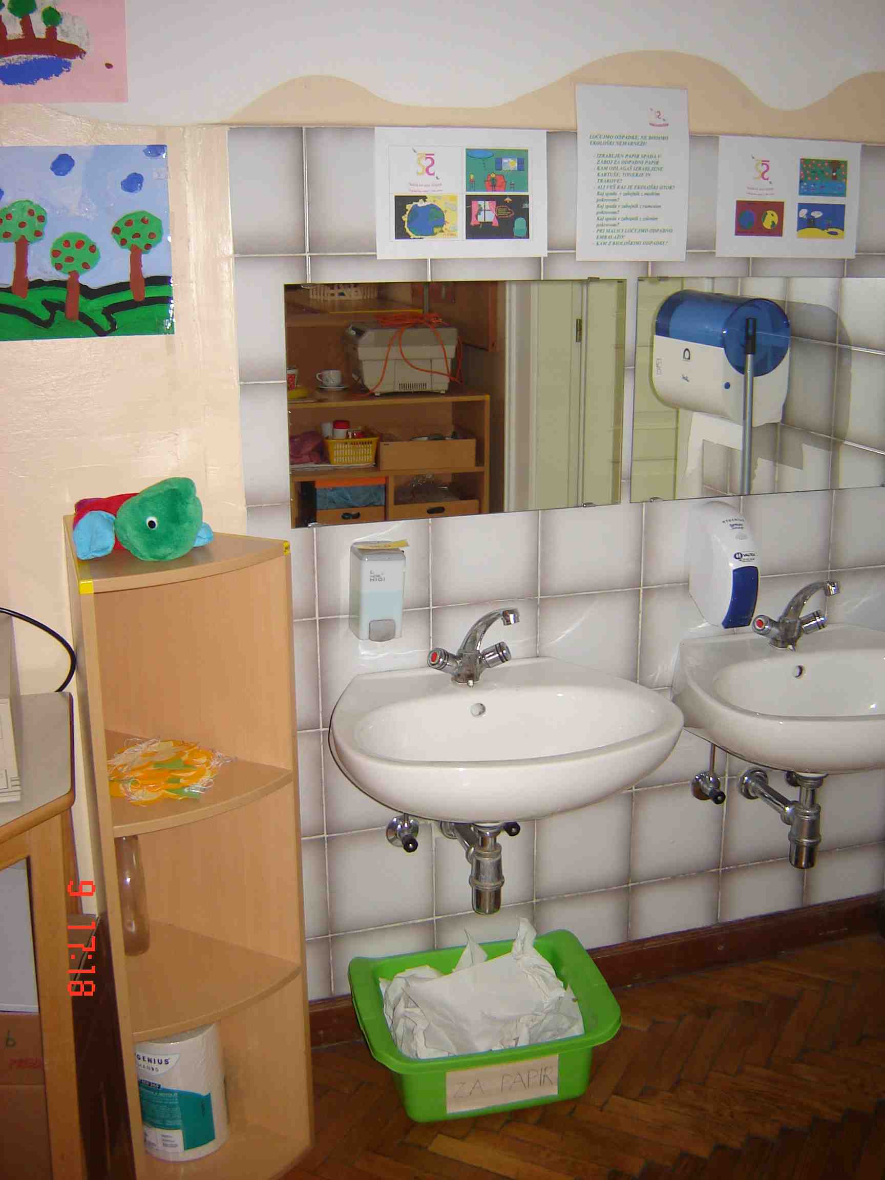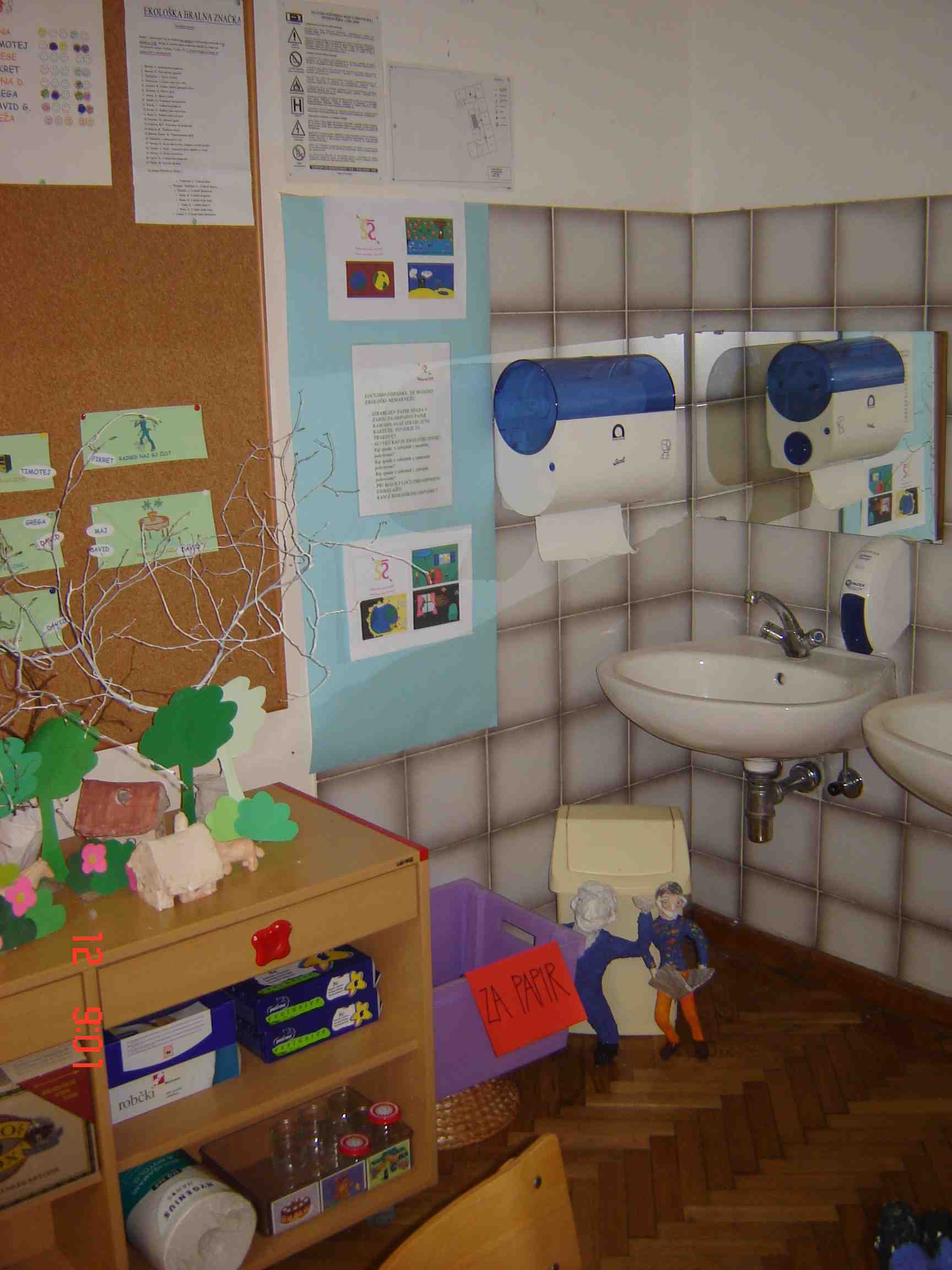 V vsakem razredu je EKO KOTICEK, kjer so posode za ločeno zbiranje odpadkov ter računalniške risbe učencev, ki opozarjajo na
