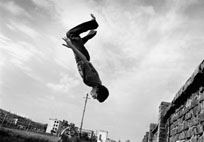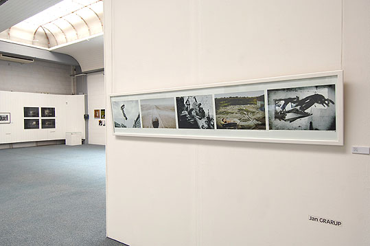 »To live or …« Installation 2005 (detail: Boy Jumping of A Wall In Grosny, Checbia, 2002)