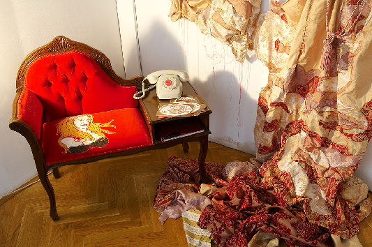 Zlati kanape, 2005 (tkanina, vezena pena, les, starinski telefon)