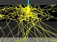 Monte Carlo modeling software produces visual models of electron beam/ specimen interactins for scanning or transmission electron microscopy. Any sample chemistry can be modeled. Model bulk materials, standalone thin films, or films on substrate and inclusions in the matrix. The image shows primary electron interaction volume in the hipotetic thin film sample with Au, Cu steel layers thickness of 1000 A at 20 kV and 0 degrees of tilt angle.