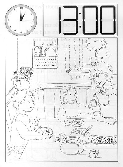 Zuerst gibt es Nudelsuppe. Danach essen sie Fleisch mit Kartoffeln und Gemüse. Zum Nachtisch gibt es Eis.