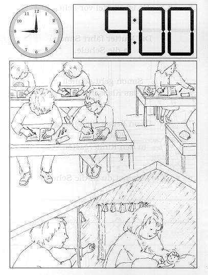 Simon hat Englisch. Er schreibt die Sätze in sein Heft. Später hat er noch Mathematik.