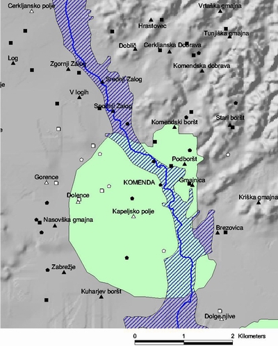 Slika prikazuje izrez iz slike 1 z uporabo dodatnih virov. Svetli znaki predstavljajo poljske temni pa gozdne toponime. Trikotniki predstavljajo toponime moderne topografske karte 1 : 25.000, kvadrati toponime moderne topografske karte 1 : 5.000 in petkotniki toponime Franciscejskih katastrov. Svetel poligon predstavlja polourno ekonomsko zajetje zgodnjesrednjeveške naselbine na Komendi, èrtano je poplavno podroèje reke Pšate.