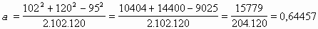 Uporabi kosinusni izrek : c2 = a2 + b2 – 2.a.b.cos g c2 = 72 + 5,52 - 2.7.5,5.cos 54º31'c2 = 49+30,25 - 77.0,58046 c2 = 34,5548 c = c = 5,88m Kot a bi lahko izračunal po sinusnem izreku sin a : sin g = a : c ! Izračunal ga boš iz kosinusnega izreka: a2 = b2 + c2 – 2.b.c.cos a a2 - b2 - c2 = - 2bc.cos a /(-1) b2 + c2 - a2 = 2bc.cos a / delimo z 2bc cos a = cos a = cos a = 0,24466 a = 75º50'Kot b dobiš iz obrazca za vsoto kotov v triktniku. b = 1800 – ( a + g ) b = 1800 – ( 75º50' + 54º31' )b = 1800 – 1300 21' b = 490 38' b) Znane so vse tri stranice trikotnika: 1. Reši trikotnik s podatki a = 95cm, b = 102cm, c = 120cm a , b , g = ? Iz a2 = b2 + c2 – 2. b . c .