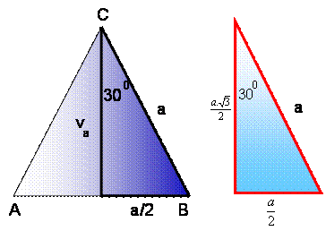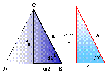 VREDNOSTI KOTNIH FUNKCIJ ZA KOTE 30º , 45º IN 60º. KOTNE FUNKCIJE KOTOV 30º IN 60º LAHKO IZPELJEŠ IZ PRAVOKOTNEGA TRIKOTNIKA, KI JE POLOVICA ENAKOSTRANIČNEGA TRIKOTNIKA.Na sliki je enakostraničnemu trikotniku narisana višina na stranico a.