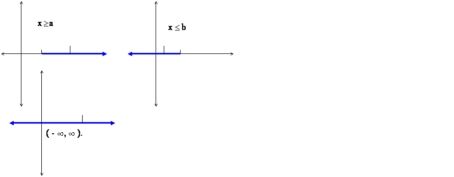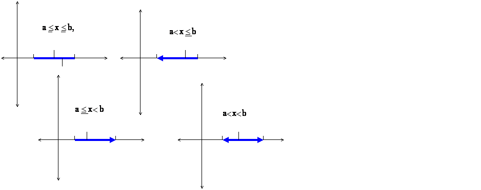 Pojem spremenljivkeSpremenljivka x je znak za več različnih števil. Konstanta a je znak za eno samo določeno število. Število vrednosti, ki jih more spremenljivka x zavzeti, je lahko končno ali neskončno. Če je x vsako realno število med realnima številoma a in b, pravimo, da je x zvezna realna spremenljivka v intervalu a in b. To zapišemo v obliki a £ x £ b, pri pogoju a < b in da spadata a in b k intervalu. Tak interval imenujemo zaprti interval. Intervala a < x £ b in a £ x < b sta delno zaprta, interval a < x < b je odprti interval. Domenimo se za način pisave: Neskončni interval( poltrak) {x; x ³ a} bomo pisali kot [a, ¥ ); poltrak {x; x > a} bomo pisali kot (a, ¥ ). Ležečo osmico preberemo kot » neskončno«. Podobno je: {x; x £ b } pišemo kot ( - ¥, b ] {x; x < b } pišemo kot ( - ¥, b )