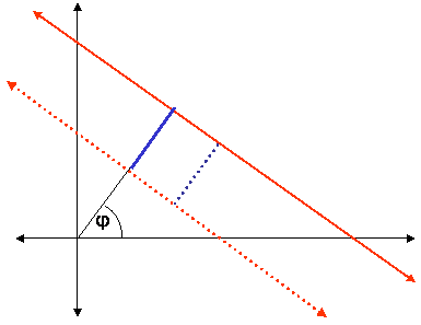 Skozi točko T1 položi vzporednico q1 k premici q. Njena enačba je x . cos j + y . sin j- (p – d) = 0.