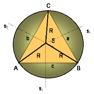 Zveži S - središče trikotniku očrtanega kroga - z vsemi oglišči A, B IN C. Tako je SA = SB = SC = R R - polmer trikotniku očrtanega kroga Trikotniki ABS, BCS in CAS so enakokraki trikotniki. Oglej si enega od njih., npr trikotnik ABS!