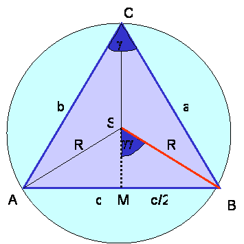V pravokotnem trikotniku AMS je: sin g= (c/2)/R c/2 = R . sin g c = 2 . R . sin g Na isti način bi izpeljal iz trikotnikov BCS in CAS : a = 2R . sin a b = 2R . sin b 2R - premer kroga Izpeljal si povezavo med stranico, njej naprotnim kotom in polmerom očrtanega kroga.