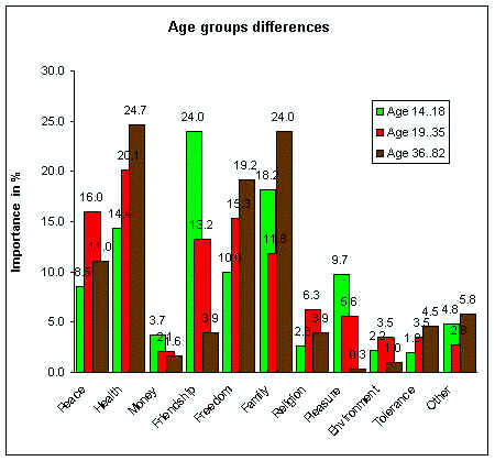 We assumed that differences among different age groups were sustainable and so it was! Pay attention to the dispersion of data among different age groups. There are the biggest possible differences in values like Health, Friendship, Family and Pleasure, while there are no statistically important differences at all in values like Money, Freedom, Religion and other values. The only quite normal difference is in Tolerance.