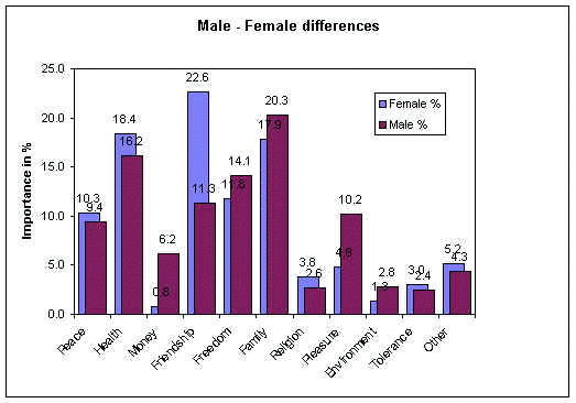 Since most answers came from the USA, we decided to make a comparisson between them. Values like Freedom, Religion, Peace, Environment and Tolerance are more important for Americans. Values like Pleasure, Friendship and Health appears to be more important for Slovenians. The two seems to agree about the importance of Family Life only. Interesting, isn't it ?
