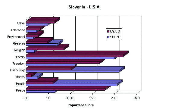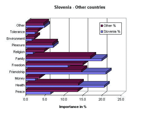 In Slovenia, Friendship, Health and Family values are more respected than in other countries, while Religion, Peace and Freedom are much more respected values in other countries.