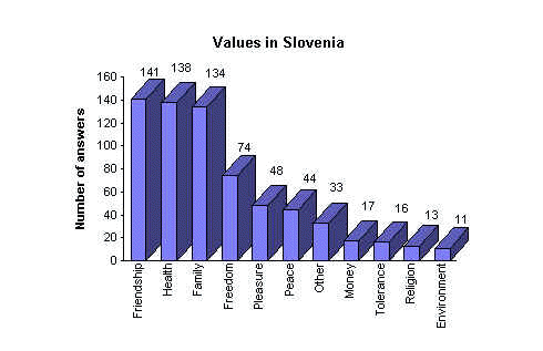 In our country, Friendship is the most respected value. Health and family life are very close. However, other values are statisticaly not so important. It is interesting that Friendship is the most respected value in Slovenia for last ten years or so, since there have been similar researches in the past, so we had a chance to compare the hierarchy of values through relatively long period of time. We believe that such outcome is a result of a tradition in our country.