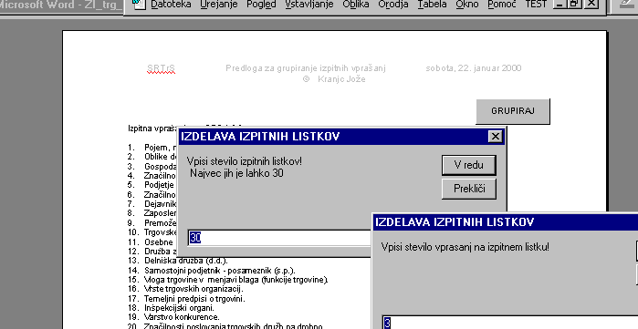 V prvo vrstico zaporednega spiska vpišemo oznako izpitnih vprašanj. Ta oznaka se bo kasneje izpisala na vsakem izpitnem listku. Zaporedno oštevilčenje listkov bo izvedeno avtomatsko. Po vpisu vseh izpitnih vprašanj datoteko shranimo za primer neželenih posledic pri nadaljnji obdelavi. S klikom na ukazni gumb "grupiraj" zaženemo VBA program. Nato z vpisom podatkov v pogovorna okna določimo število vprašanj na posameznem listku in širino presledka med izpitnimi listki (število praznih vrstic). Besedilo izdelanih izpitnih listkov še poljubno oblikujemo za izpis (velikost znakov, širine robov ipd. ).