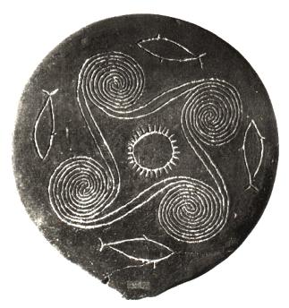 "Kot ribe plavamo, prejo, labirinte odstiramo Ribe se zadevajo s simbolično plavutjo na trupu ob klobčiče preje... Klobčiči so naviti v nasprotni smeri kot je smer plavanja rib. Klobčiči simbolizirajo labirinte in nemoč dostopa: do SONCA, do bistva stvari, do božjega... Ribe so simbol dobe rib, zgodovinskega duhovnega obdobja Človeka. Tovrstna razlaga pove mnogo več kot npr. zgolj figurativna zgodba o ribah na viharnem morju, ki kot vsako neurje zastira Sonce. Starodavna umetnost je bil a polna simbolov ter podpomenov.