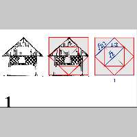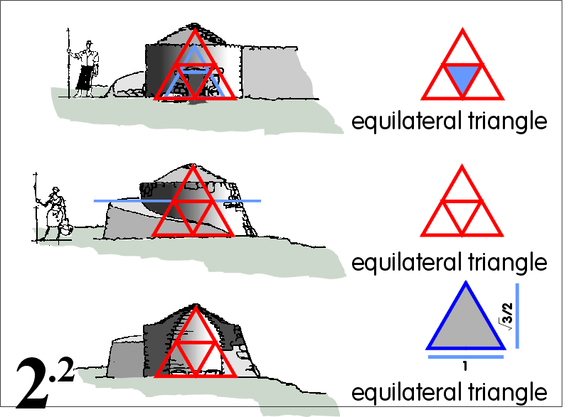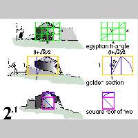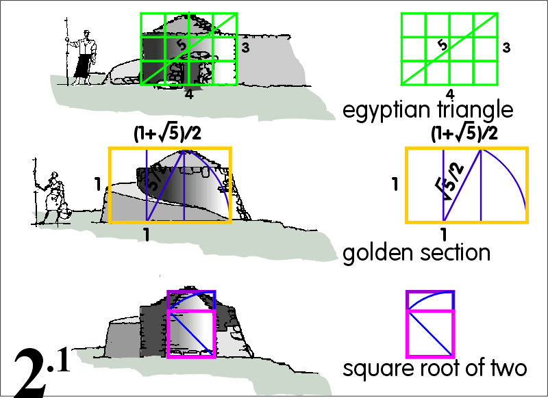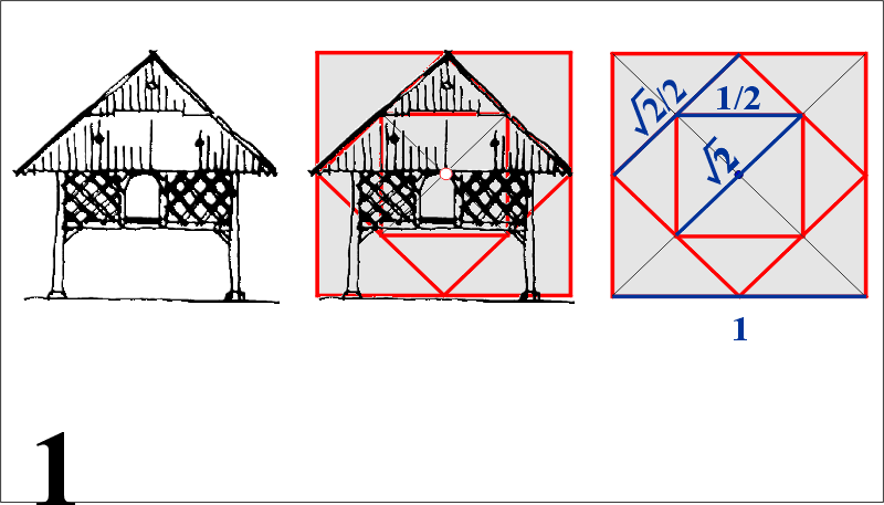 Gre seveda predsvem za uporabo kvadrata in za rast z njim. Tako nastopajo mere 1 (stranica kvadrata), 1/koren iz 2 kot polovica diagonale in kot stranica včrtanega kvadrata, koren iz 2 pa je diagonala kvadrata in stranica očrtanega kvadrata. Slednja dva sta seveda zavrtena za 45 stopinj.