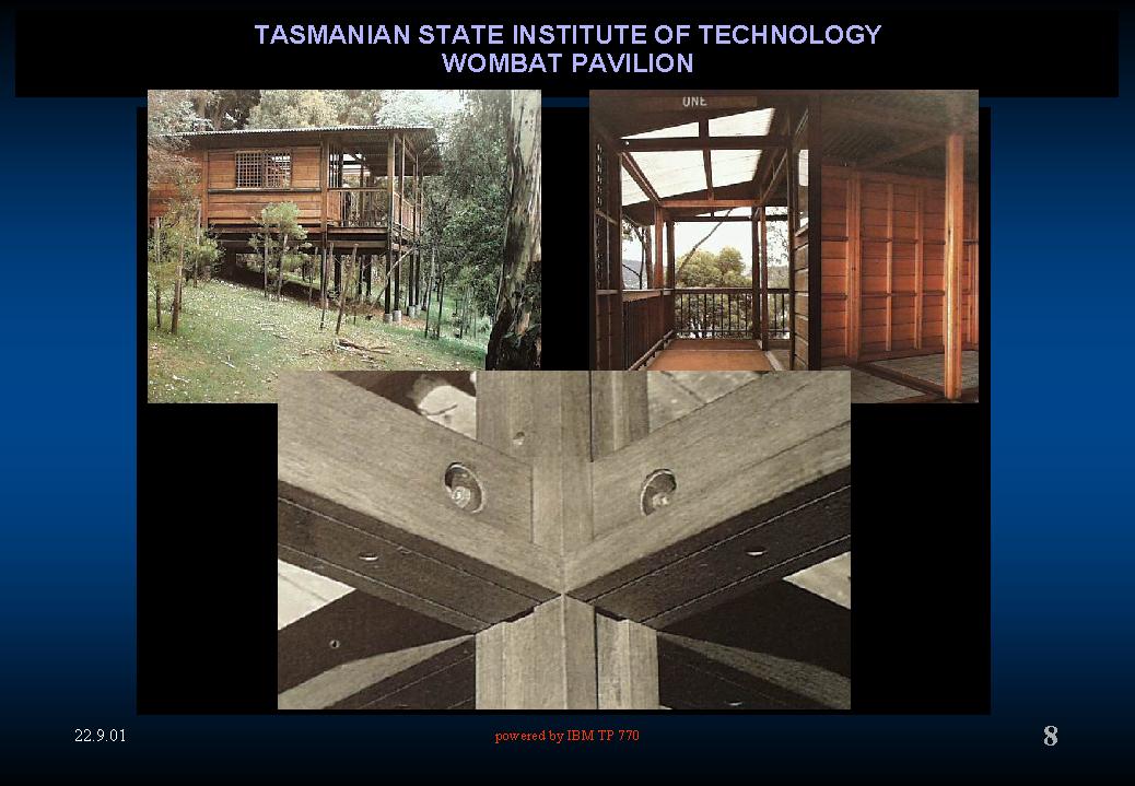 Slijedimo li taj razvojni put u logici konstruiranja nailazimo na suvremene, ilustrativne primjere regionalnih škola arhitekture s kraja 20tog stoljeća pri kojima se njeguju gore opisane različitosti i pristupi oblikovanja u drvu. Tasmanian State Institute Of Technology prezentira školu koja njeguje i unapređuje tradicionalne vještine linearnog konstruiranja u drvu, provodeći praktične vježbe građenja sa svojim studentima (Wombat Pavilion) (fig.8.).