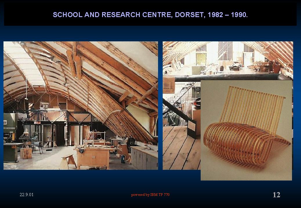 Sljedeća dva primjera programa edukacije i primijenjenih metoda istraživanja, razvijaju znanja i vještine konstruiranja trodimenzionalnim strukturnim mrežama te kompozitima iz drva. To su; School And Research Centre, Dorset, 1982-1990, arhitekata Richarda Burdona Of Ahrends Burdon & Korelek i Biro Happold uz savjetodavnu pomoć i utjecaj Otta Freia (fig. 11., fig. 12.), te UNESCO-v Laboratory And Building Workshop, Vesima, Italija, 1991, arhitekta Renza Piana (fig. 13.). Laboratorij se koristi kao istraživački centar za konstruktivne aplikacije iz prirodnih materijala ispitujući pri tom strukturalni potencijal biljaka i vegetabilnih vlakana te višeslojnih obloga koje doprinose nižoj energetskoj upotrebi u zgradama. Izvorišta tog pristupa designu nalaze se u nisko-tehnološkim (low-tech) vještinama oblikovanja u bambusu i prepletu poput onih poticanih programom Brameen Bank Housing iz 1989 godine, Bangladesh (fig.14.) kao i u tehnološkim transferima vještina dizajniranja npr.: u brodogradnji, avio-industriji, itd. (fig.15., fig.16., fig.17.).
