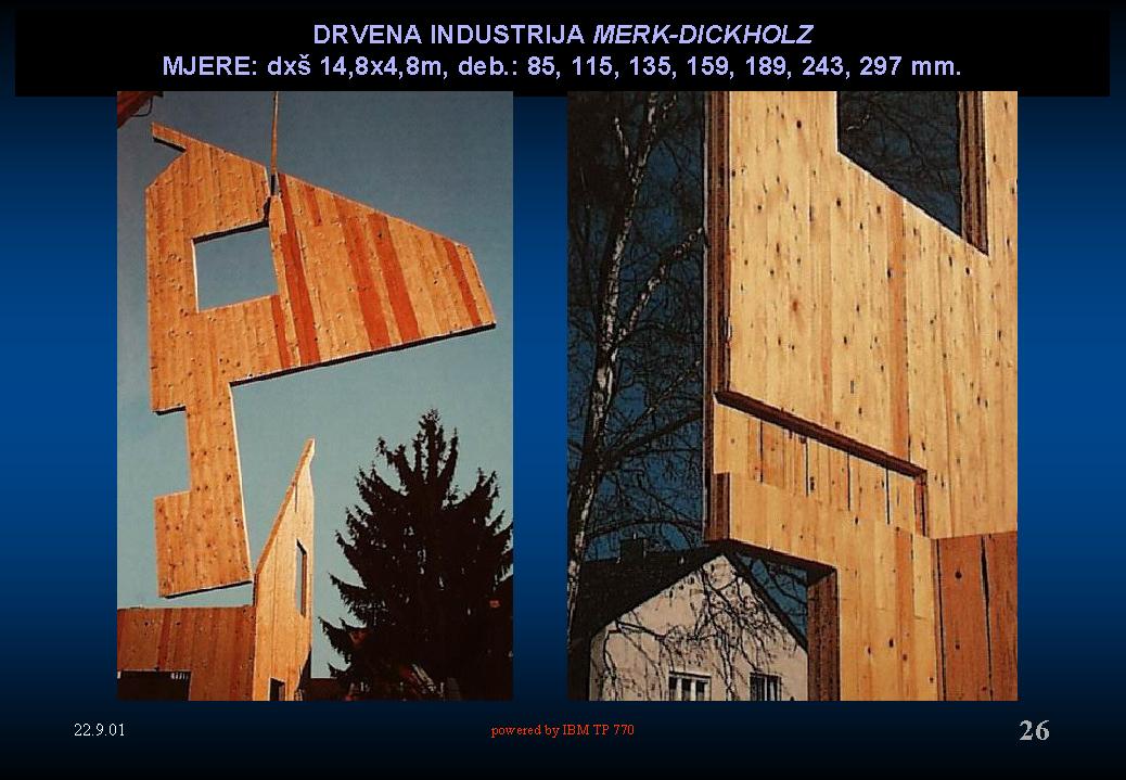 Proizvodnja veliko formatnih drvenih kompozita bitno je promijenila tektonske elemente arhitektonskog plana što ima za posljedicu i odgovarajuća ograničenja u oblikovanju arhitektonske cjeline. Drvena industrija Merk-Dickholz pokazuje nam istovremeno na pozitivnu i negativnu stranu tog fenomena (fig. 26.). Formiranjem pročelja kao zabatnih, nosivih i montažnih diskova racionaliziraju se postupci u tehnici građenja ali se istovremeno problematizira i način oblikovanja arhitektonske granice između vanjskog i unutrašnjeg prostora. Mišljenja smo kako u prosječnoj arhitektonskoj produkciji ova tehnologija nudi više ograničenja nego prednosti no kao i uvijek, stvaralaštvo pod kondicijama tehnologije predstavlja izazov te otvara pitanja o potencijalima arhitekata.