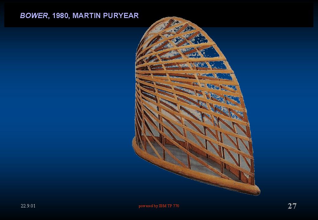 Istaknimo sada još jedan pogled na prostorne konstrukcije iz drava pri kojem će metafora tzv. male forme arhajskog skloništa u prostorima vernakularnog, arhitektonskog izraza poslužiti za uspostavu relacije između linearnih i prostorno trodimenzionalnih struktura jednako kao i amalgamirati veze između niskih i visokih tehnologija gradnje u drvu. U svakom od sljedećih primjera ističe se posebna briga za karakter detalja, preciznost i vještinu građenja baš kakvima se simbolično prikazuju pri Boweru Martina Puryear-a (fig. 27.) ili u apsolutnom formatu pri hramovima Ise, Geku.