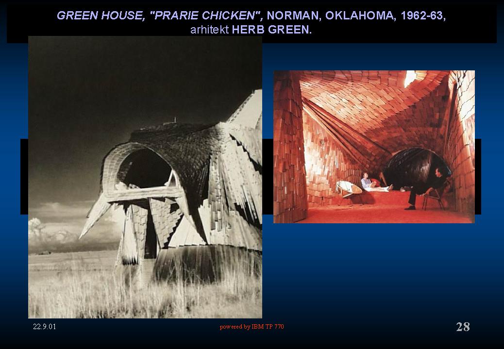 "Prarie chicken" ili kuća Green, arhitekta Herba Greena (fig. 28.) predstavnik je preriskog Campa iz svojevremene klasifikacije Charlesa Jencksa i Susan Sontag te pripada izrazu Postmoderne arhitekture. Metafora naturalnog, koliko god bila pastoralno mekana u svom konceptualnom izrazu sadrži u sebi toliko potrebnu, gotovo biološku neposrednost konstruiranja. Drveno sklonište Greena koliko god da temelji na aditivnoj linearnosti međusobno povezanih drvenih elemenata ne rezultira sekvencionalnim prostornim sklopom već naprotiv formira ambijent prostornog kontinuuma. U visokim tehnologijama ta će se vrsta imanentne iskrenosti konstruiranja pretvoriti u transponirani, bionički koncept designa no kako je ta tema u ovoj prilici izvan fokusa našeg interesa vratimo se ambijentu kontinuuma pri maloj vernakularnoj formi.