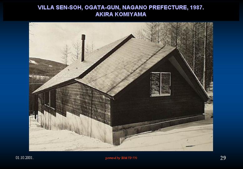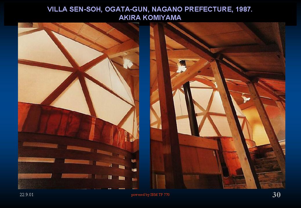 Vila Sen-Soh u Naganu, arhitekta Akira Komiyama (fig. 29., fig. 30.) također posjeduje gore navedene prostorne odnose i to sasvim izvjesno sa manje iskrenosti od Greena ali zato i sa više iznenađenja kao i neposrednosti veze sa Fullerom. U primjeru Akire, standardna "kutija" male kuće za odmor sa dvostrešnim krovom formirana je kao jednovolumenski, unutrašnji prostor. Nad galerijom kata, u slobodnim konstruktivnim presjecima formira se mikro ambijent sa dvije polu transparentne kupole.