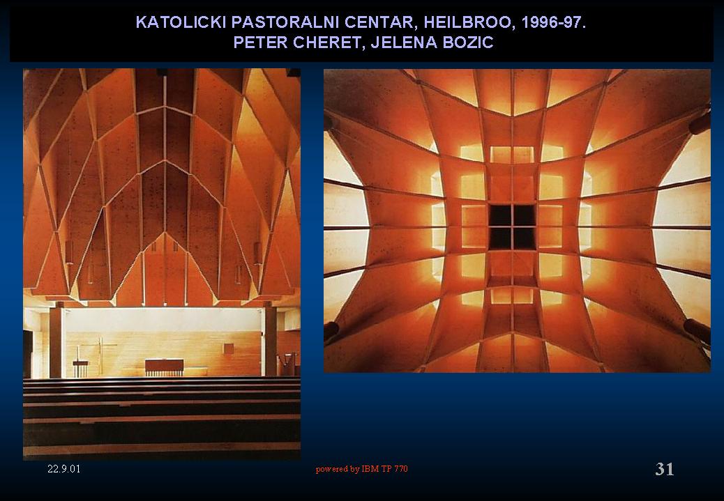 Pastoralni centar Heilbroo, arhitekta Petera Chereta pokazuje nam način oblikovanja arhitektonske granice vanjskog i unutrašnjeg prostora uz primjenu velikoformatnih kompozitnih nosaća iz drva na zahtjevnoj temi crkvenog krovišta. Prostorna mreža iz drva skriva svoju tehniku gradnje koju uvjetuju; veličina prefabrikata, transportno-tehnička sredstava prijevoza i profili prometnica koji dovode elemente do mjesta gradnje te ukupna brzina podizanja konstruktivne cjeline. Elementi konstrukcije se ravninski sastavljaju u horizontali tla te se nakon toga svaki od diskova dizalicom rotira i podiže na svoju konstruktivnu, vertikalnu poziciju u prostoru.