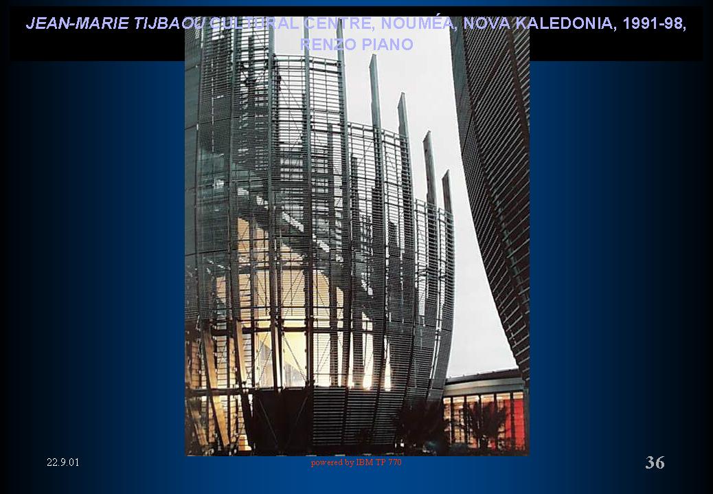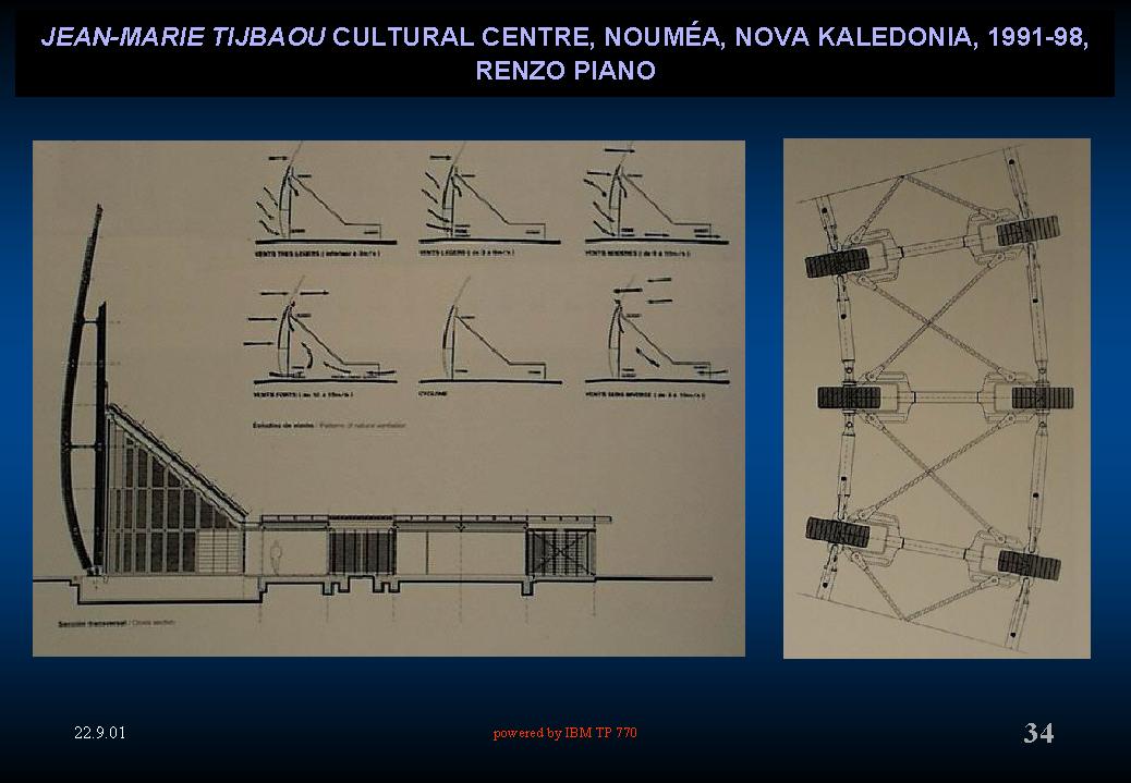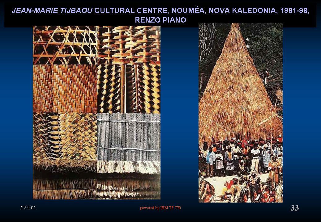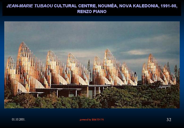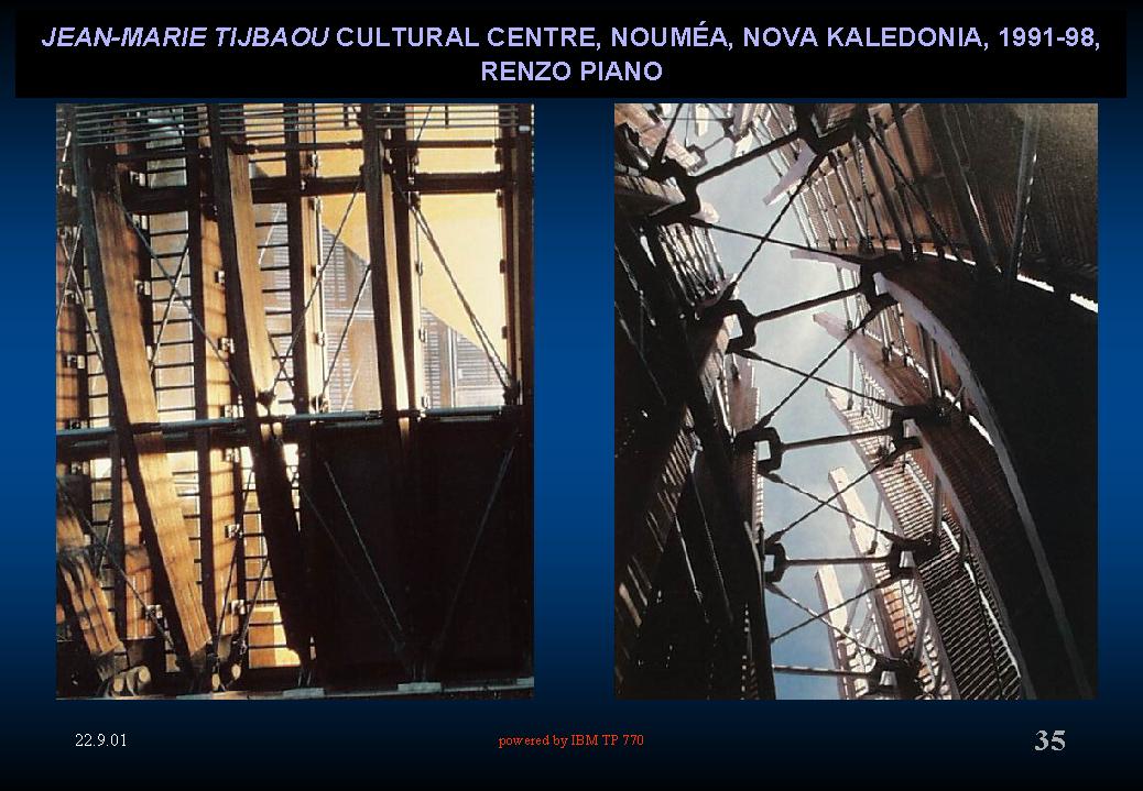 Jean-Marie Tijbaou Centar Kulture, u Nouméa-u, Nova Kaledonia, arhitekta Renza Piana iz 1998 godine (fig. 32., fig. 33., fig. 34., fig. 35., fig. 36.) sintetizira nam većinu do sada iznesenih elemente analize vernakularnih izvora novih tehnologija građenja strukturnim mrežama i kompozitima iz drva. Arhitektura centa pronalazi svoje vernakularne izvore u formi stambene kuće Nove Kaledonije, membranske materijale i preplet iz drva in situ interpretira na novi, tehnološki način. Kompleks je lociran na mjestu koje graniči sa vodama lagune na jednoj i otvorenim oceanom na drugoj strani. Izložen je agresivnoj atmosferskoj sredini sa velikim rasponom vjetrova koji dolaze iz više smjerova. Zgrada se svojim presjekom na pasivan i aktivan način prilagođava atmosferskim pritiscima, tvoreći tako optimalne uvjete za svoje sadržaje. Dvostrukom fasadnom, membranskom ovojnicom postižu se uzgonske sile i elementi podtlaka u cirkulaciji zračnih struja te pruža i dodatna insolaciona zaštita. Konstrukcija je radijalno spregnuta dvojna membrana od prefabriciranih kompozitnih, drvenih nosača unikatne izrade. Vanjska membrana konstruktivno je transparentna i propusna dok unutrašnja predstavlja granicu kakvu poznajemo pri standardnim pročeljima. Investicijska vrijednost centra izgrađenog uz potporu Francuske vlade je približno 60 miliona DEM.