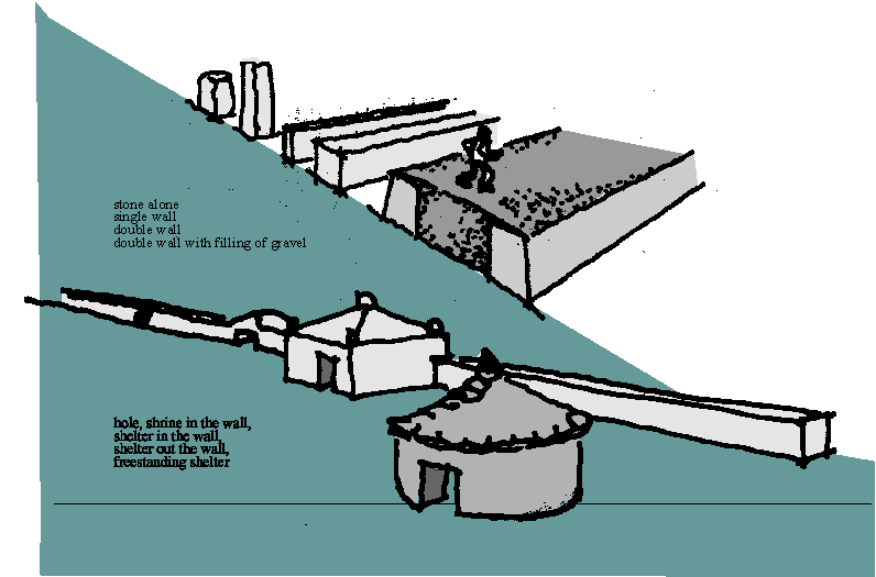 Kamnite konstrukcije brez veziva so značilnost dežel z mnogo kamna. Po eni strani razvoj pogojuje potreba po rodni zemlji, po drgi preobilica kamna. Za prvo značilnost je rešitev: čiščenje polja ali pašnika, za drugo pa kam z odvečnim kamnom.