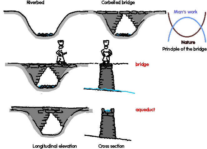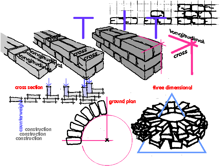Konstrukcijski principi zidanja suhega zidu vzdolžno je kombinacija vzdolžnikov in prečnikov, s prekrivanjem. V prostoru je edina možnost korbeling, stopničenje.