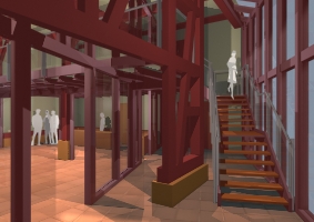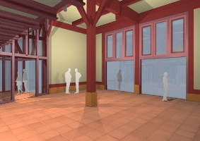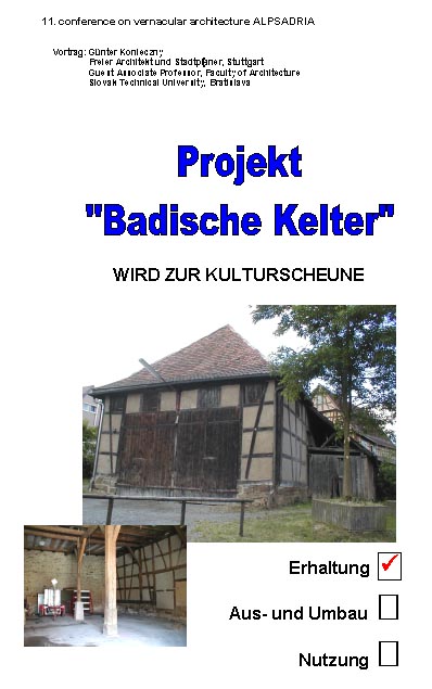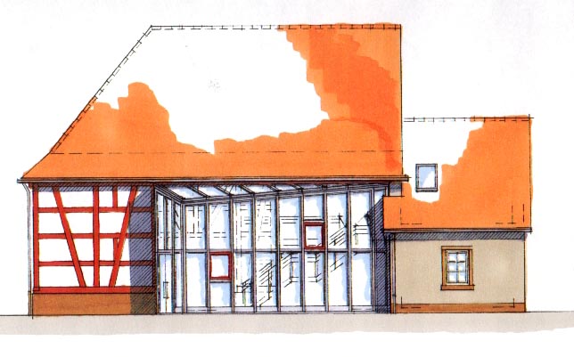The buildings history and its budget must be taken into consideration when finding a functional and purposeful solution. One would need to consider the multi-functional possibilities of a "cultural shed", as local events, meetings, visitor activities and classes should be able to be housed here. Furthermore wine seminars , exhibitions and family festivities should be possible. A Diploma submission at the University of Stuttgart resulted in the development of the first concrete vision for a design, which was then discussed with the council. The pre-design was based on the council’s early visions, in which the extension (lobby and entrance, stairway to gallery) has been designed in a steel/glass construction. In many discussions with the conservation group and the council, the building’s extension, with ist intruding glass structure, was modified. Construction should be realised in 2002. Existing structure, goal orientation, planning structure and plans will be presented and discussed.