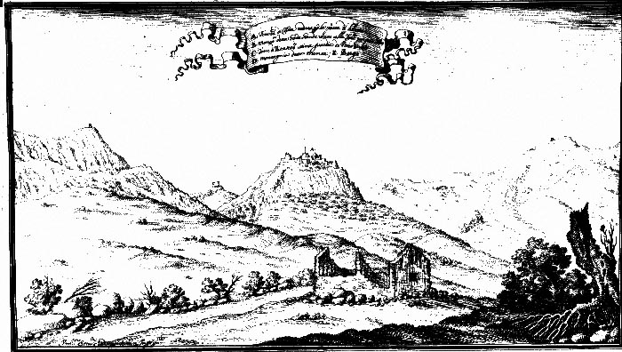 Giusepe Santini:The Klis Fortress, drawing from 1668. Destroyed house might have been on the location of latter growing the Pleština neighborhood