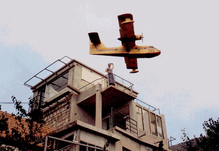 Gornje etaže kuće-prozor Picasso na jugu- sa avionom za gašenje požara , snimljeno pred samo ispuštanje vode na vatru nadomak kuće, 15.VIII,2000.