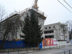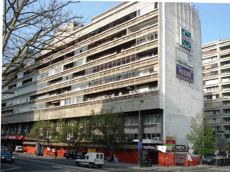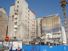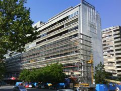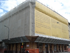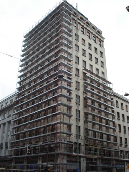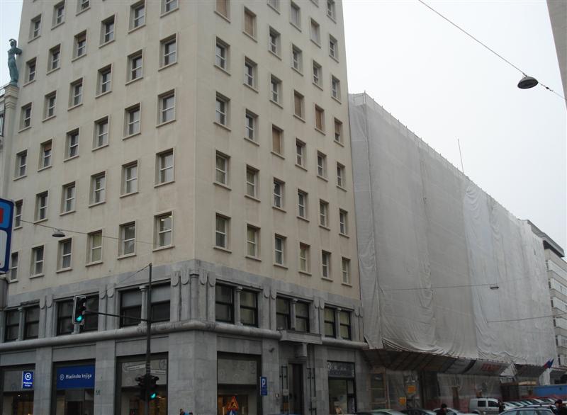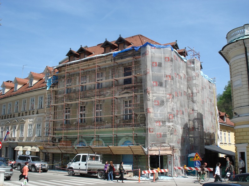Slovenski cesti 53. Aprila 2010 so začeli odstranjevati gradbene odre in šele leta 2012 dokončali tudi stranski fasadi. |