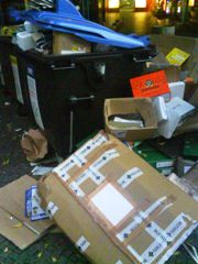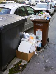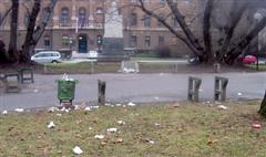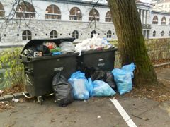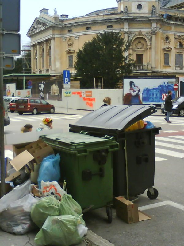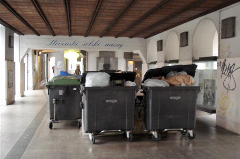 okras npr. pod arkadami na Slovenski cesti. Ponekod zasedajo tudi dragocene parkirne prostore. Z gradnjo potopnih smetnjakov se razmere izboljšujejo.