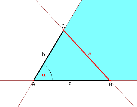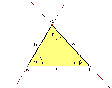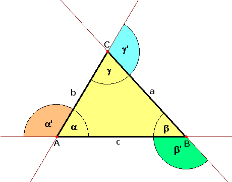 Kote med stranicami trikotnika imenujemo notranji koti trikotnika. Notranje kote označujemo z grškimi črkami: α, β, γ. Kot α ima vrh v oglišču A. Kot β ima vrh v oglišču B. Kot γ ima vrh v oglišču C. Trikotnik je kot del ravnine presek notranjih kotov. Sokote notranjih kotov imenujemo zunanji koti trikotnika. Zunanje kote označujemo z grškimi črkami: α', β', γ'. |
