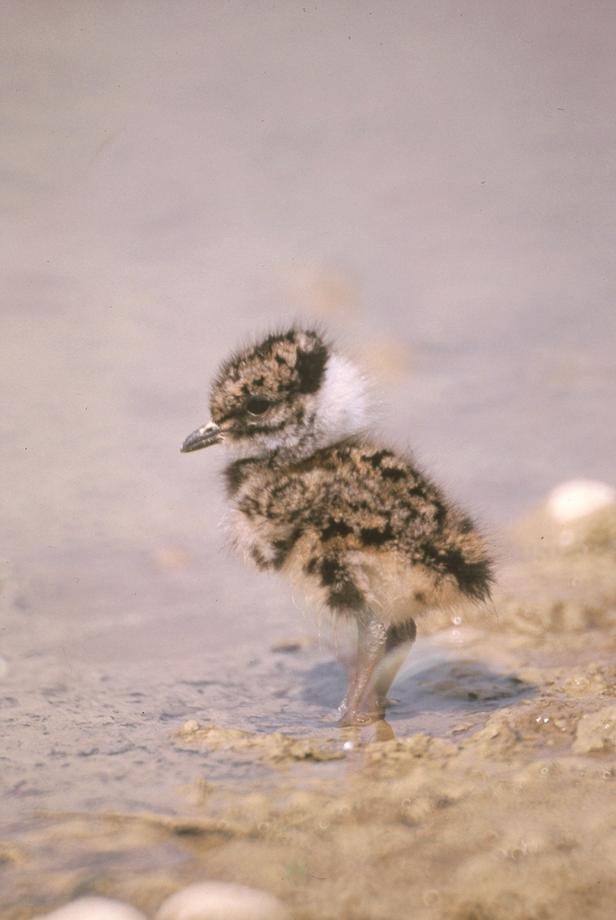 Nekaj dni star mladič ob vodi v gramoznici išče hrano.
