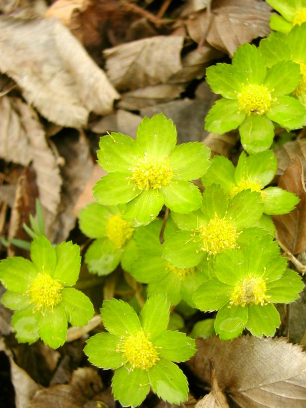 Sloveniji. Navidezni runemo zeleni cvetovi so v resnici socvetja, rumeno