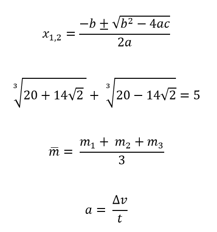 1. Odpri prazen dokument. 2. Tvoja naloga je setaviti in zapisati matematične izraze, ki jih prikazuje slika. 3. V zavihku VSTAVLJANJE klikneš ENAČBA. Na listu se ti odpre polje kamor lahko vnašaš enačbo. 4. Poleg polja se ti odpre tudi nov zavihek NAČRT (Orodja za enačbe). Tu boš našel vse potrebno za oblikovanje enačb in izrazov. 5. Izdelek shrani v mapo WORD VAJE pod imenom Vaja11. |