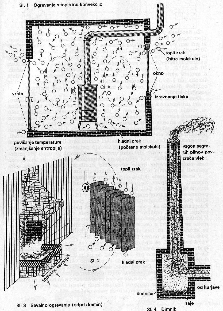 Ogrevati pomeni v ožjem pomenu zvišati temperaturo nekega prostora. To pa lahko storimo z zvišanjem temperature zraka, ki obdaja ljudi ali predmete (konvekcijsko ogrevanje), ali pa z obsevanjem s toplotnimi žarki. Pri konvekcijskem ogrevanju (sl. 1) se zviša temperatura zraka, ki se dviga ob peči ali ob ogrevalnem telesu (radiatorju: sl. 2), tj., poveča se kinetična energija molekul zraka (v slikah 1 in 2 so natisnjene hitre molekule rdeče, počasne pa črno). Če obogatimo zrak v sobi s hitrimi molekulami tako, da ga ogrevamo, se zviša prostorska temperatura, vendar se celotna energija v prostoru ne spremeni. Če bi hoteli povečati toplotno energijo konstantnega vo¬lumna zraka, bi se moral zvišati tudi zračni tlak. Stanovanjski prostori pa niso nikdar hermetično zaprti; skozi razpoke in špranje oken in vrat, pa tudi skozi tramovje tal in stropov in zaradi poroznosti zidov in sten se tlak v prostorih stalno izravnava s tlakom v okolici. Ogrevanje torej ne poveča toplotne energije v prostoru, temveč samo zviša temperaturo v prostoru. Kvocient toplotna energija: temperatura se zmanjša. Ta kvocient imenujemo reducirano toplotno količino in z njeno pomočjo merimo entropijo. Ta veličina izraža toplotno energijo. Naravni pojavi potekajo vedno v smeri padajoče temperature, tj. v smeri zmanjšanja toplotne energije in v smeri povečanja reducirane toplotne količine tj. povečanja. entropije. Za zmanjšanje entropije in s tem za povečanje temperature potrebujemo vir toplote (npr. peč). Temperatura (točneje: entropija) zavzema, da uporabimo ta primer, v »tovarni« naravnih pojavov funkcijo »direktorja«, ker odloča o njihovem poteku. Medtem pa daje energija le podatke za »računovodstvo«, ki mora izenačiti »bilanco«. Pri nobenem konvekcijskem ogrevanju se torej kljub dovajanju energije ne poveča toplotna energija v ogrevanem prostoru, pač pa se zmanjša njegova entropija (zviša se temperatura). Tudi pri drugi vrsti ogrevanja, pri sevalnem ogrevanju, se zmanjša le entropija, toda ne obdajajočega zraka, temveč le obsevanega telesa. Najstarejše sevalno ogrevanje je ogrevanje s kaminom (sl. 3). Žareči premog ali polena so tu vir toplotnega sevanja. Moderna sevalno-ogrevalna telesa so npr. umetno sonce ali infra rdeči sevalniki, pri katerih se pretvarja električna energija v toplotno energijo. Pri vseh ogrevanjih, pri katerih sprejema vir toplote svojo energijo od zgorevalnega procesa (kurjenje z lesom, premogom, oljem), igra odvajanje zgorevalnih produktov skozi dimnik poleg tega, da odstranjuje dimne pline, še eno važno vlogo. Ker so segreti plini (torej tudi segreti zrak) lažji, kakor pa je okoliški zrak, se dvigajo (vzgon, glej str. 6T4). Odvajanje dimnih plinov skazi dimnik povzroča torej v kuriščih (zgorevalnih prostorih) določen vlek, ki je tem večji, čim višji je dimnik in čim višja je temperatura dimnih plinov kurišč, ki so priključena na ta dimnik (sl. 4). Ta vlek razvnema zgorevalni proces. Na spodnjem delu dimnika je tako imenovana dimnica, v kateri se usedajo trdni delci, ki so jih potegnili s seboj dimni plini, in delci, ki ostajajo zaradi nepopolnega zgorevanja goriv (saje).