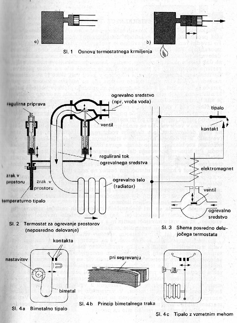 Termostati ali temperaturni regulatorji so priprave, ki držijo želeno temperaturo na konstantni vrednosti. To dosežejo s tako imenovanim temperaturnim tipalom, ki »otipa« razliko do želene temperature in odda to informacijo organu, ki izravna temperaturno razliko. Za temperaturna tipala uporabljamo s tekočino napolnjene cevi, bimetalne trake in vzmetne mehe. Najenostavnejši je neposredno delujoči termostat. Pri njem uporabljamo lastnost skoraj vseh tekočin da se raz¬tezajo, če jih segrevamo (sl. 1). Sam termostat obstaja iz cevi, ki je napolnjena s tekočino, ki se pri segrevanju posebno močno razteza (sl. 2). Termostat je zvezan s krmilnim stožcem ventila v cevovodu za ogrevalno sredstvo po kapilarni cevki, ki je tudi napolnjena z enako tekočino. Če je npr. temperatura zraka in s tem temperatura prostora višja od želene, se tekočina v tipalu raztegne ter premaga vzmetno protisilo v ventilu ter ga s tem pripre ali zapre. Tok ogrevalnega sredstva se zmanjša, s tem pa tudi oddaja toplote. Zaradi tega se po kratkem času zmanjša temperatura v prostoru, kar ohladi tudi tekočino in jo skrči. Vzmetna protisila v ventilu je zato večja od pritiska tekočine in ventil zopet odpre. Tako vzdržujemo temperaturo prostora med neko najmanjšo in neko največjo vrednostjo; njuna medsebojna razlika pa je malenkostna. Temperatura prostora je torej praktično konstantna. Želeno vrednost prostorske temperature nastavimo na skali, ki jo umeri že tovarna. Z vrtenjem vijaka regulirne priprave tekočina bolj ali manj stisne vzmet ventila in zato se ventil bolj ali manj odpre. Pretočna količina ogrevalnega sredstva je torej večja ali manjša, kar povzroči, da se naravna višja ali nižja temperatura prostora (sl. 2). Drugi tip predstavljajo posredno delujoči termostati, ki potrebujejo za prenos impulza, ki vodi do spremembe temperature, pomožno energijo (bodisi električni tok ali pa stisnjen zrak). V teh pripravah tipalo vzpostavi kontakt, tj., sklene tokokrog (sl. 3). S tem pa vplivamo na regulacijske organe zagrevanja (npr.: elektromagnet ustrezni ventil odpre ali zapre). Če pa uporabljamo npr. zgoraj opisano, s tekočino napolnjeno dilatacijsko tipalo, sklene kontakt pri rastoči temperaturi raztezajoča se tekočina. Ventil sprejme nato z električnim tokom povelje za zapiranje. Pri ohladitvi poteka seveda postopek v nasprotni smeri. Ko pa dosežemo nastavljeno minimalno temperaturo, se skrči tekočina do določene stopnje in prekine. tokokrog tako, da elektromagnet ne drži več ventila v zaprtem položaju in ogrevalno sredstvo prične zopet teči. Poleg s tekočino napolnjenih tipal uporabljamo tudi tako imenovana bimetalna tipala (sl. 4b). To so drobni trakovi, ki so sestavljeni iz dveh različnih kovin, ki se pri segrevanju različno močno raztezata. En konec tega bimetalnega traka je fiksiran. Če temperatura naraste, se razteza ena kovina močneje kakor druga. Zato se bimetalni trak tako ukrivi, da more s svojim prostim koncem sprožiti kontakt (sl. 4a). Tretja vrsta tipal so vzmetni mehi, ki so napolnjeni z lahko uparljivo tekočino ali s kakim plinom (sl. 4c). Naraščajoča temperatura povzroči naraščanje volumna polnitve, kar razteza meh ter lahko sproži kontakt. Pri padajoči temperaturi pa se vzmetni meh skrči zaradi zmanjšanja volumna polnitve, kar sklene kak drug kontakt.
