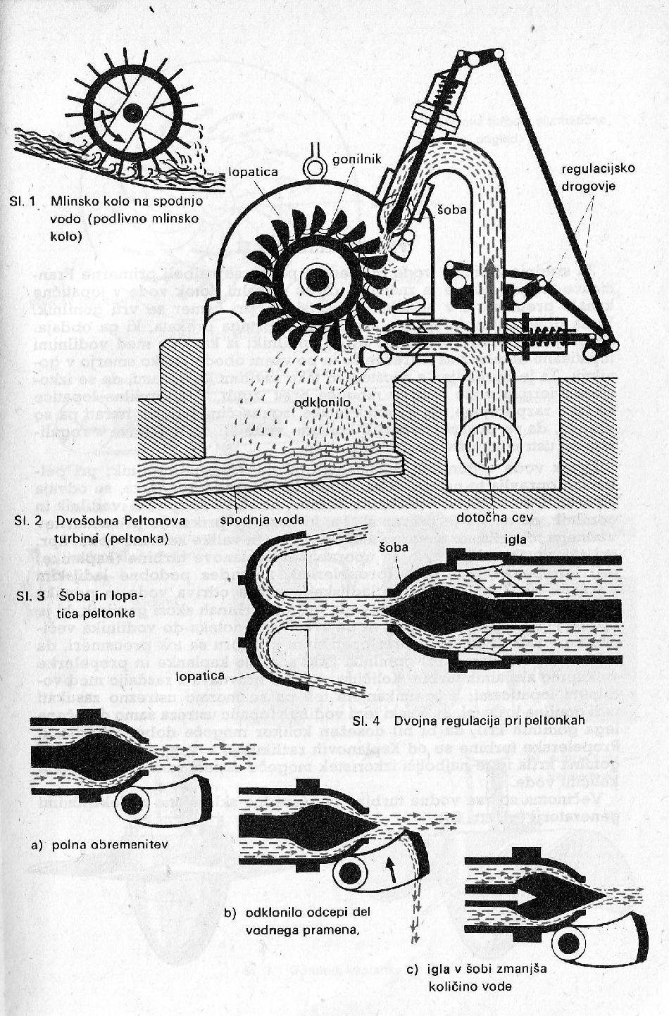 V vodnih turbinah se kinetična energija tekoče vode pretvarja v vrtilno mehansko gibanje s tem, da tok vode poganja lopatično kolo. Najpreprostejši in najstarejši vodni pogonski stroji so mlinska kolesa, ki izkoriščajo naravni padec potokov in rek. Voda udarja na lopatice velikega lesenega kolesa, ki posredno ali neposredno vrti mlinske kamne. Kadar doteka voda na lopatice od zgoraj, govorimo o kolesih na zgornjo vodo (nadlivnih kolesih), pri dotoku vode s spodnje strani (sl. 1) pa je beseda o kolesih na spodnjo vodo (podlivnih kolesih). V moderni tehniki je starim mlinskim kolesom na videz podobna Peltonova turbina (peltonka) (sl. 2), ki jo upravičeno imenujemo »turbina«, ker zanjo velja Eulerjeva turbinska enačba. Na kolutu turbine so po obodu razvrščene lopatice v obliki dveh votlih polelipsoidov (sl. 3). Voda, ki izstopa iz šobe z veliko hitrostjo, udarja v lopatice in jih vrti. Vrtilna hitrost je določena s hitrostjo vode; turbina ima najboljši izkoristek, če je obodna hitrost koluta enaka polovični hitrosti vodnega curka iz šobe. Količina vode se uravnava z iglo v šobi. Pri hitri razbremenitvi turbine odkloni najprej odklonilo del vodnega curka in nato šele igla v šobi ustrezno zmanjša izstopni prerez (sl. 4). Tak način regulacije je pri hitri razbremenitvi potreben, ker bi se zaradi hitrega zapiranja šobe z iglo pojavil t. i. vodni udar, ki bi poškodoval cevovod. Regulacija je sploh odvisna od obremenitve priključenega električnega generatorja. Peltonove turbine so primerne za razmeroma visoke padce ozir. majhne količine vode. Zajetje vode visoko nad turbinsko napravo zahteva ustrezno cevovodno napravo.